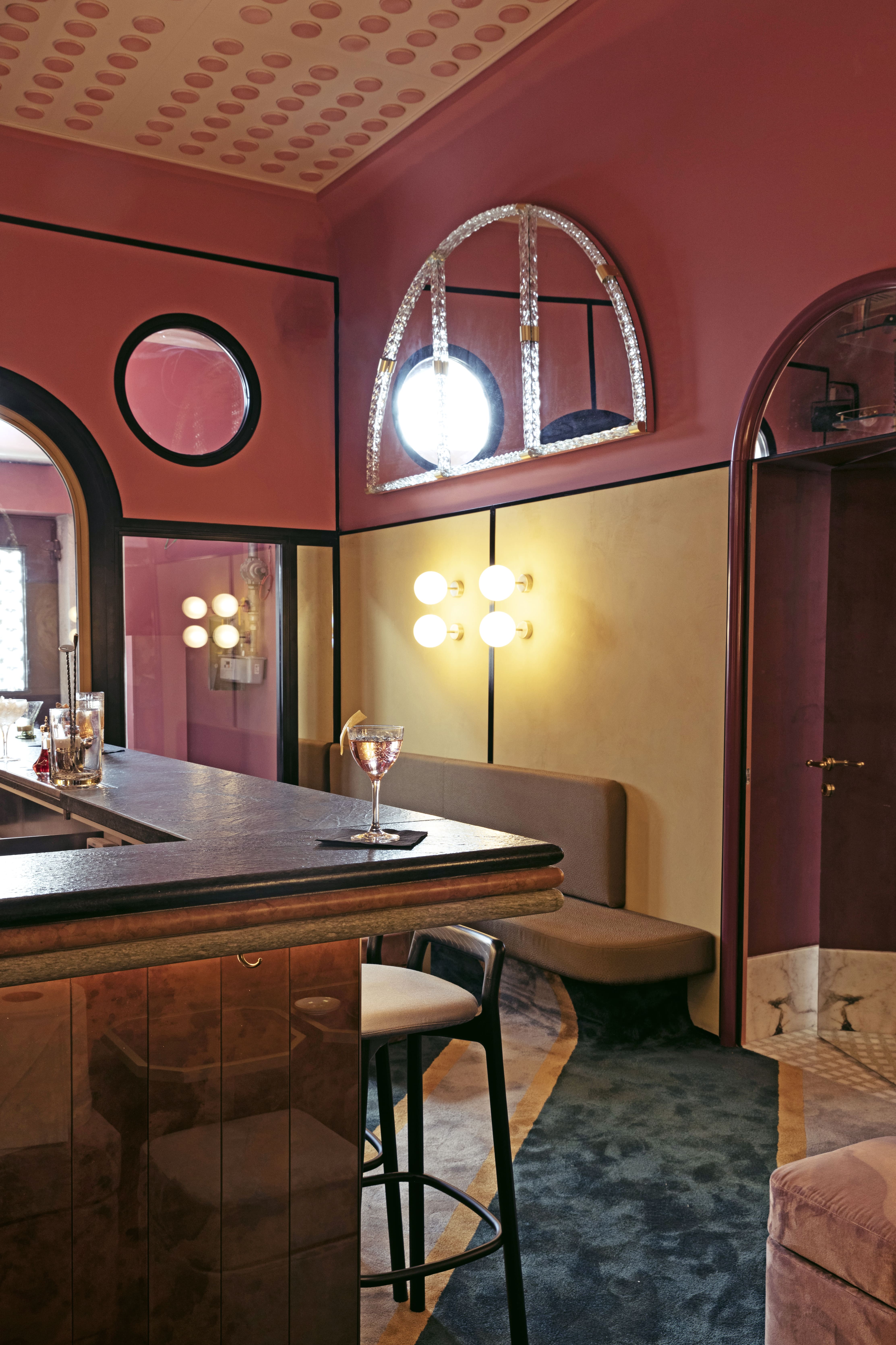 While you're waiting for an exotic cocktail, you can't help but notice the three layers of marble that make up the top part of the counter, the real protagonist of the space: the three coloured marble segments are a reference to the stones used in the Basilica of San Marco. Torchon, which is a decorative element on many Venetian historic buildings, is used for the frame of back-bar furnitures: these are made of purple lacquered wood, giving the space an almost fairy-tale atmosphere. The renowned architect has also managed to effectively mix male and female elements: the lights on the counter are reminiscent of dangling earrings and those on the wall of pearl earrings.