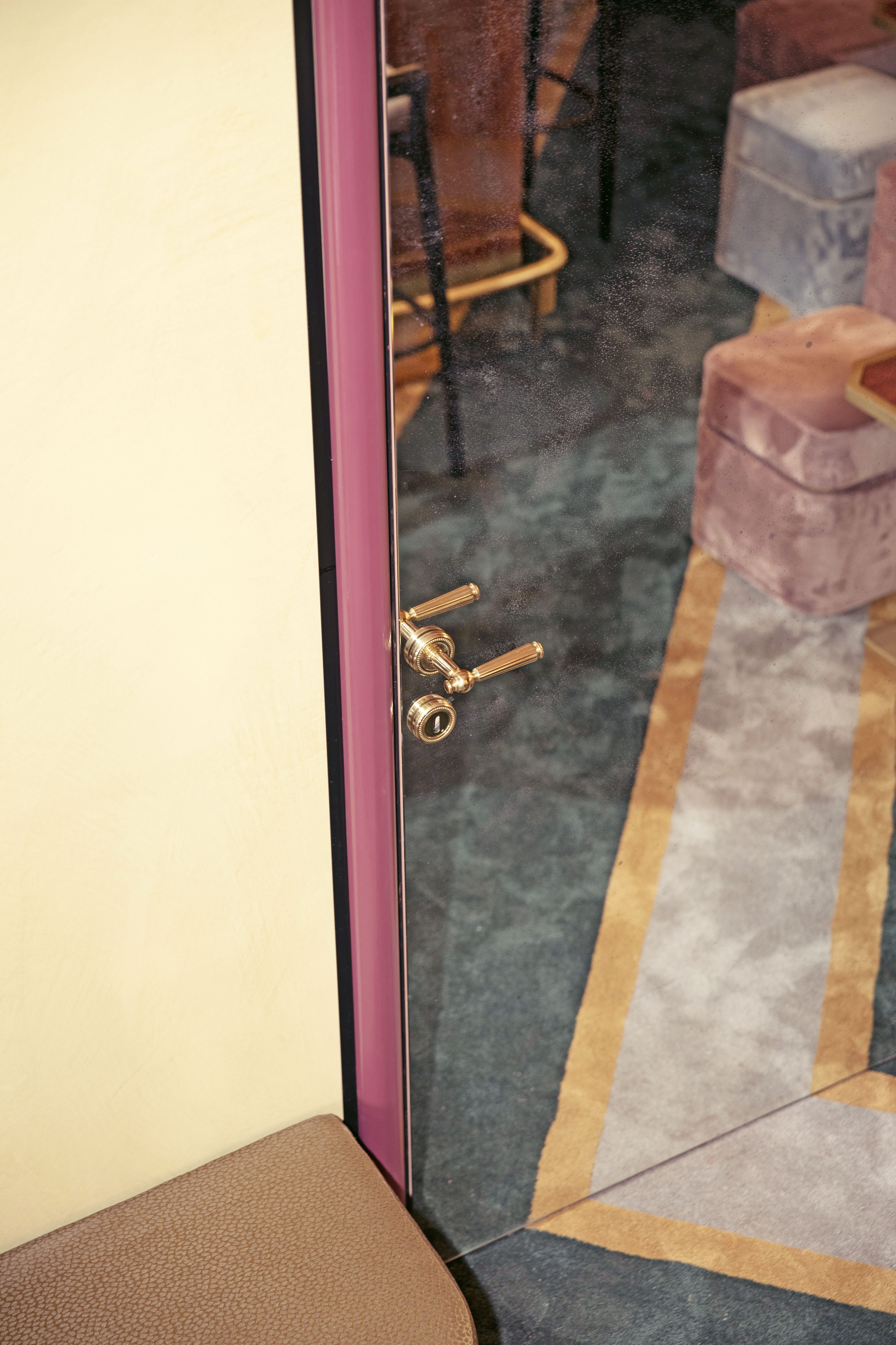 The gold and green inlaid regimental carpet that continues up onto the walls like a skirting board reminds us of typical male cravats while the tables are reminiscent of cuff links. The mirrors all around the space evocate Venetian windows (Serlians) and the walls opposite the bar, made of marmorino framed with black metal, are an homage to Venetian architect Carlo Scarpa, one of her biggest sources of inspiration.