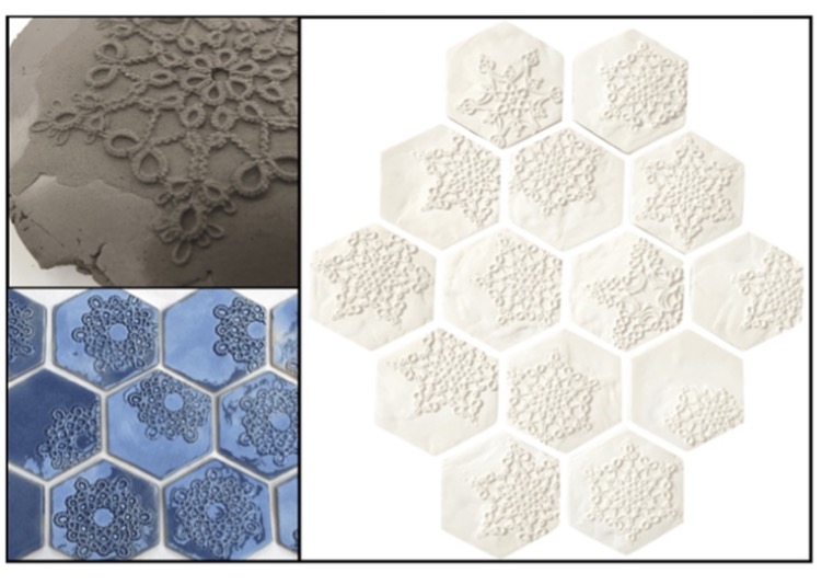 In addition to applying lace techniques to weave furniture, she has also incorporated her original lace patterns into ceramic tile. Her bas-relief tiles with original lace patterns, blends traditional craftsmanship with modern materials.