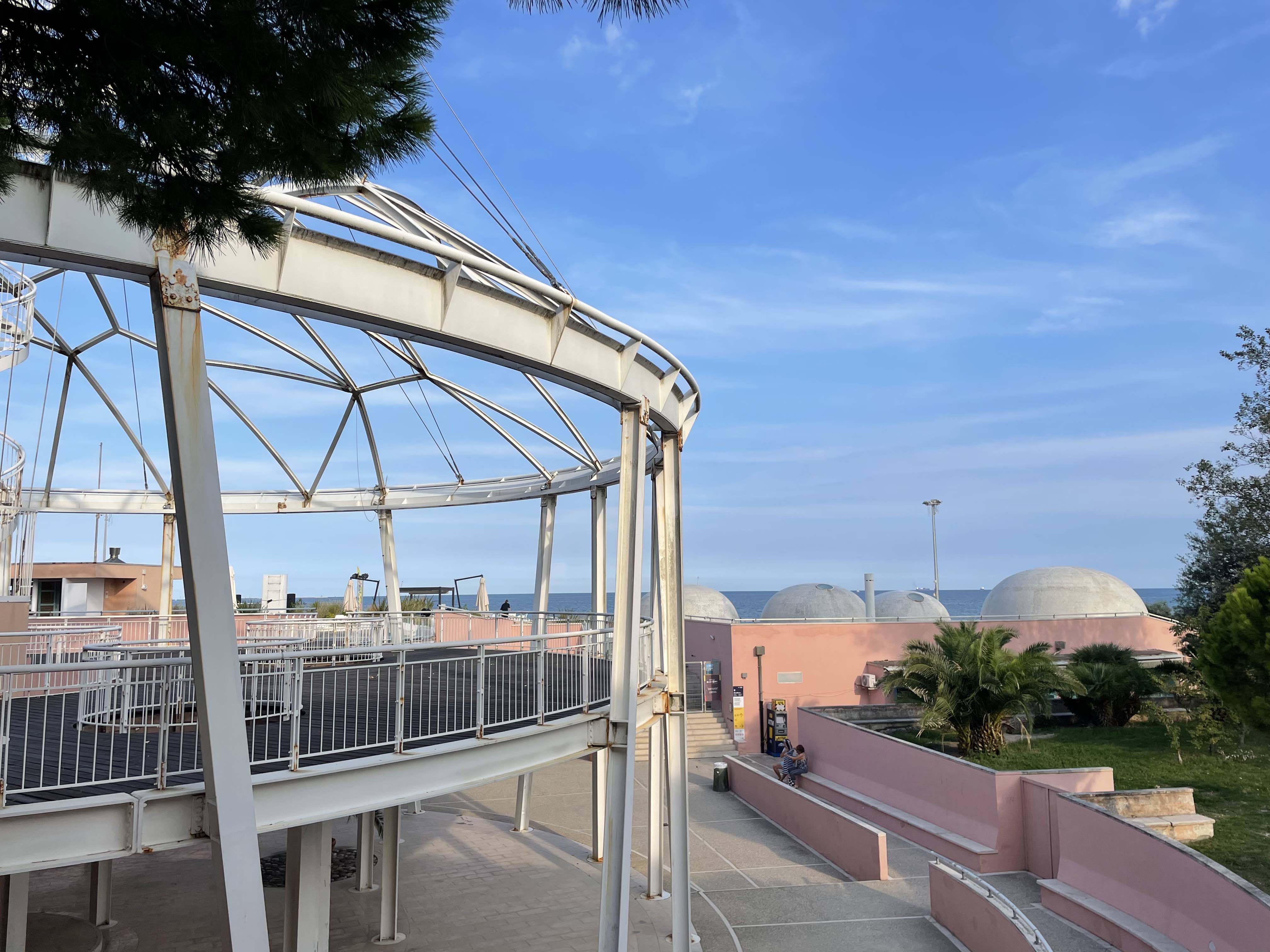 The pavilion has two levels: lower one is comprised of a covered circular square and the upper one is an open square of the same diameter with a steel dome that reminds a spider web. There is a 33-meter-high spiral staircase that starts at the upper level and lead to a small viewpoint that is visible from far away and acts a sort of a lighthouse for the visitors of the beach. The pavilion is accompanied by some service buildings, a café covered by hemisphere domes and a restaurant illuminated by a skylight. A distinctive part of this severe ensemble is a walkway that leads all the way to the sea and ends in another viewpoint. A very industrial-looking construction is surrounded by the water from one side and the tall trees from the other which creates a contrast between man-made and natural Lido.
