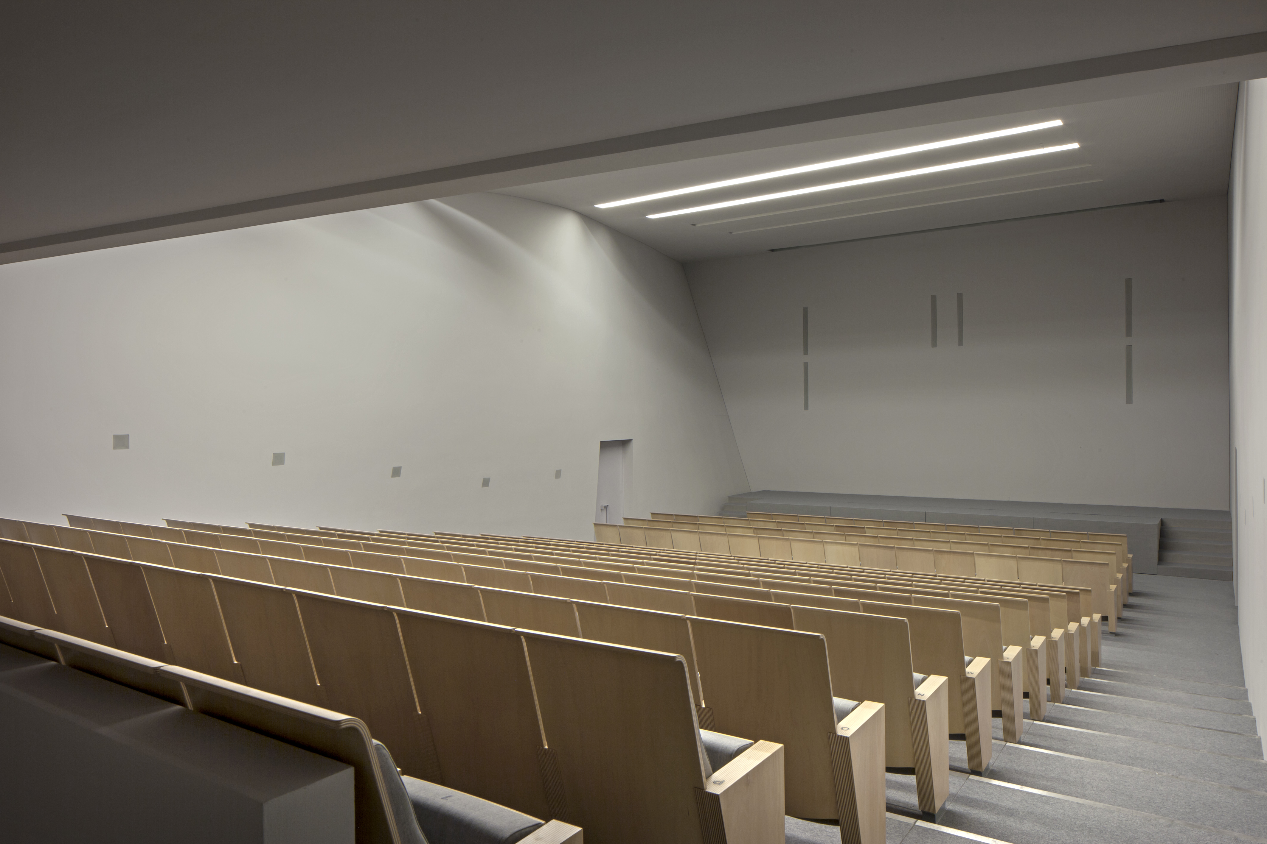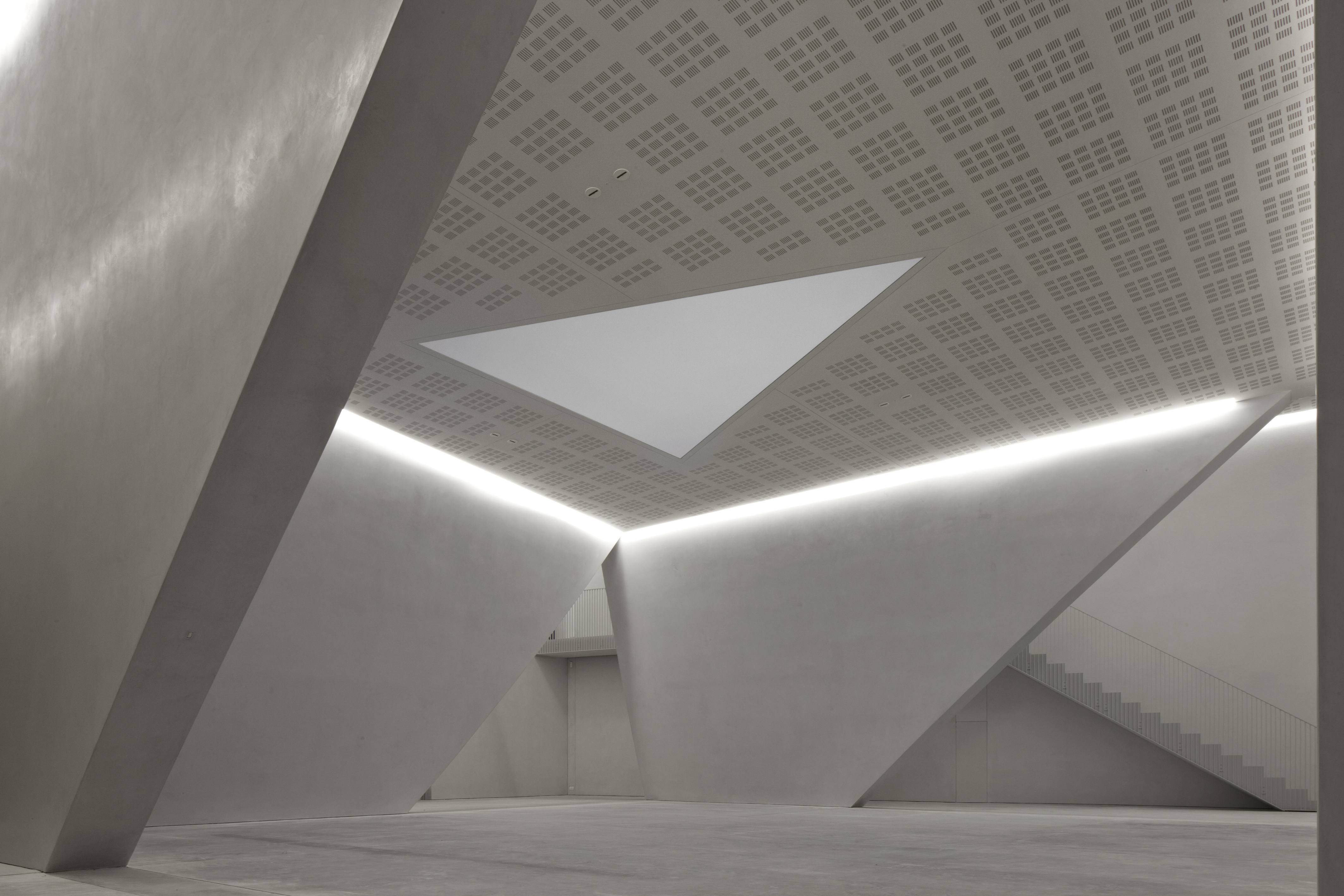 The Teatrino is spread over two large areas: a 225-seat auditorium and a foyer characterized by large triangular-shaped openings on the walls and a triangular skylight that illuminates the environment. The project is a tribute to the triangular shape, it amazes, generates a sense of movement, reflects the varied cultural programming it offers.