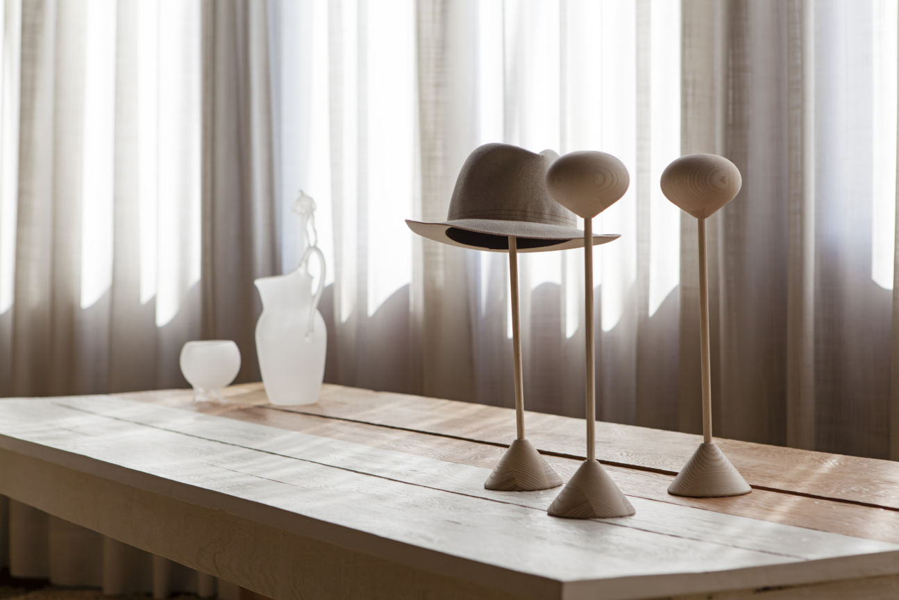 On the foreground the hat holders by Claesson Koivisto Rune for Smaller Objects, on the background the Blowing Man collection by Antonio Aricò for Editamateria