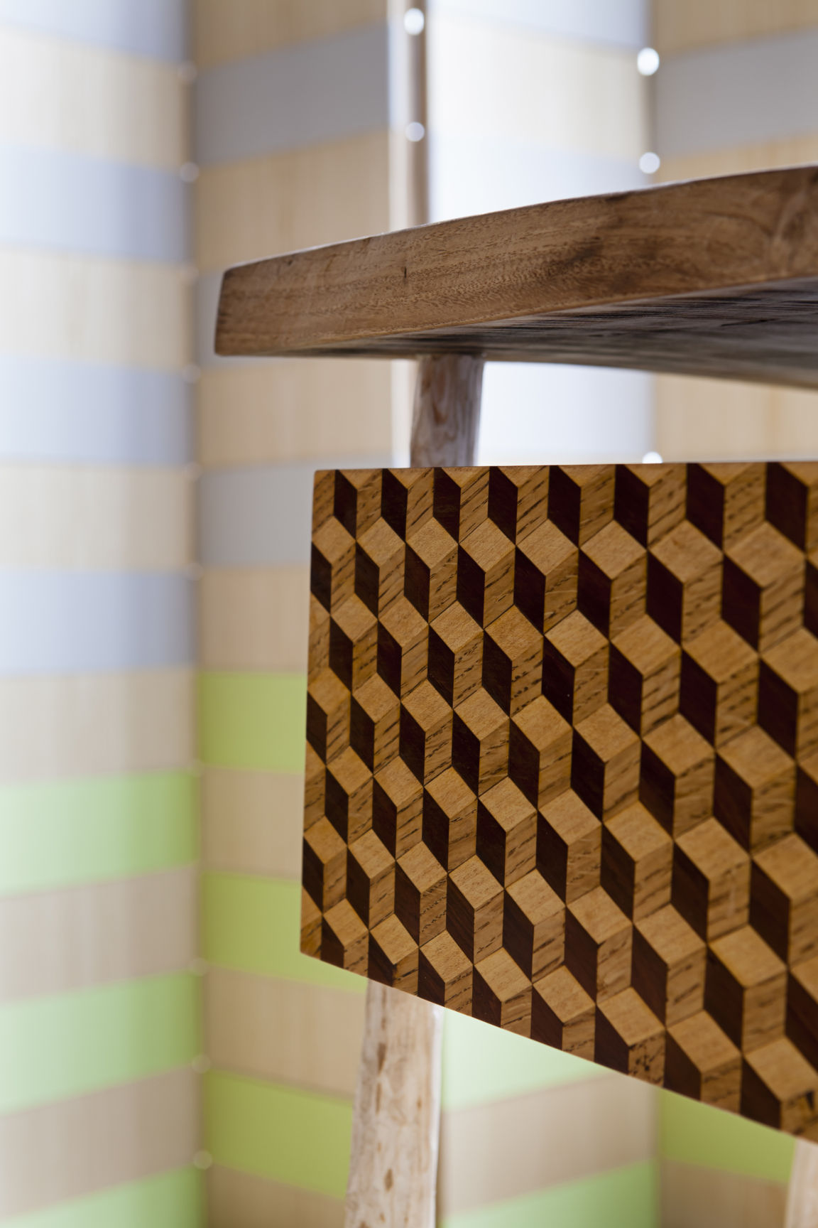 Patterned Pallet Chairs by Craft Combine, in the middle chairs installation by Lock Forniture, 3 Trois chair by Edoardo Colzani