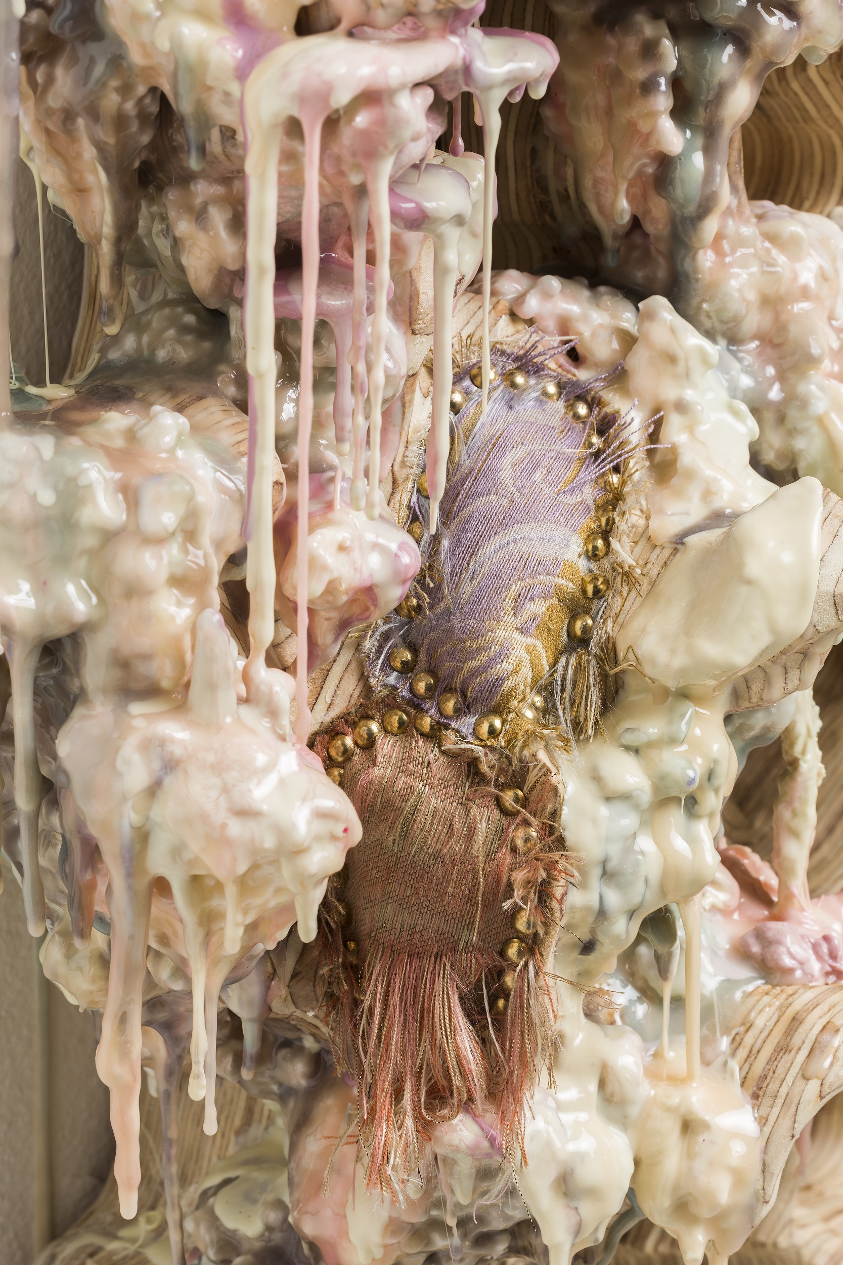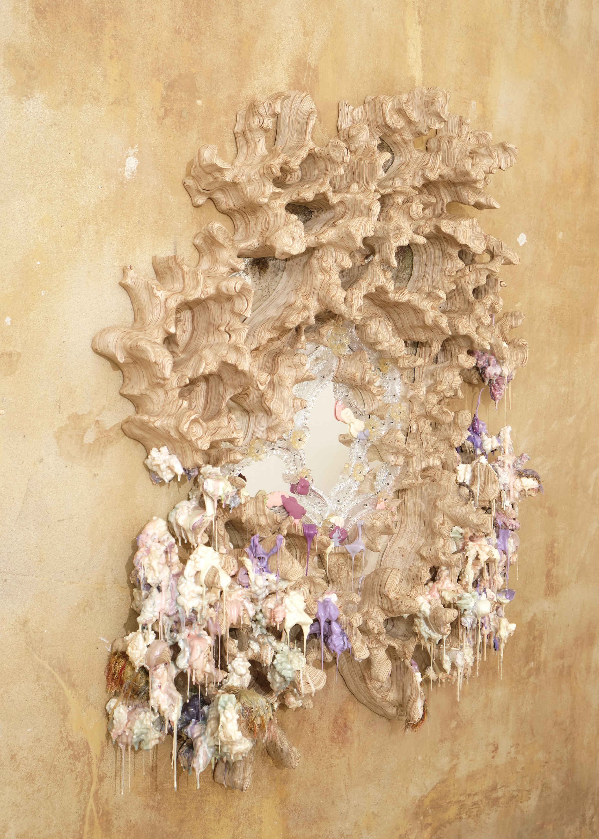 The object is formed around its center, which is inlaid with the traditional Venetian mirror - referencing historical pieces. The further from the center, the more the traditional concept of the mirror dissolves, and other materials appear. I questioned how to disrupt the visual materiality of glass and how to connect it with other elements. By experimenting with the silver oxidation, the traditional antique mirror helped me interrupt the surface of the glass, add the colors and merge it with a hand-carved wooden frame. The glue has its own importance in the piece; traditionally, it is not allowed to use glue in mirror making. I wanted to reverse that, use glue as a decorative element that would also mediate the continual interchange between surfaces of the object and surroundings. By that, the mirror offers a transition to the immediate space.