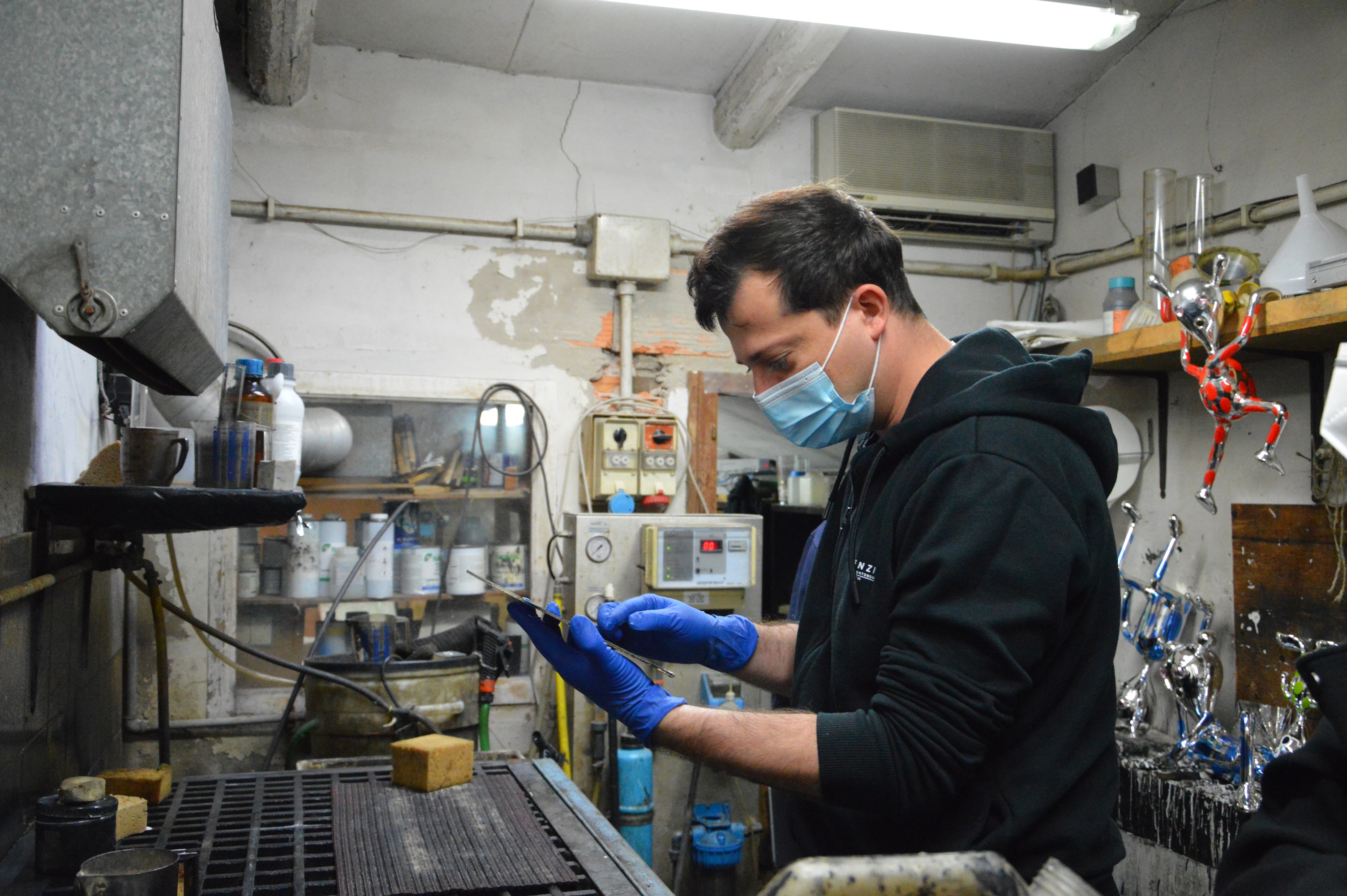 Tadeas experimenting with glass and mirroring techniques inside Ongaro e Fuga's workshop in Murano.