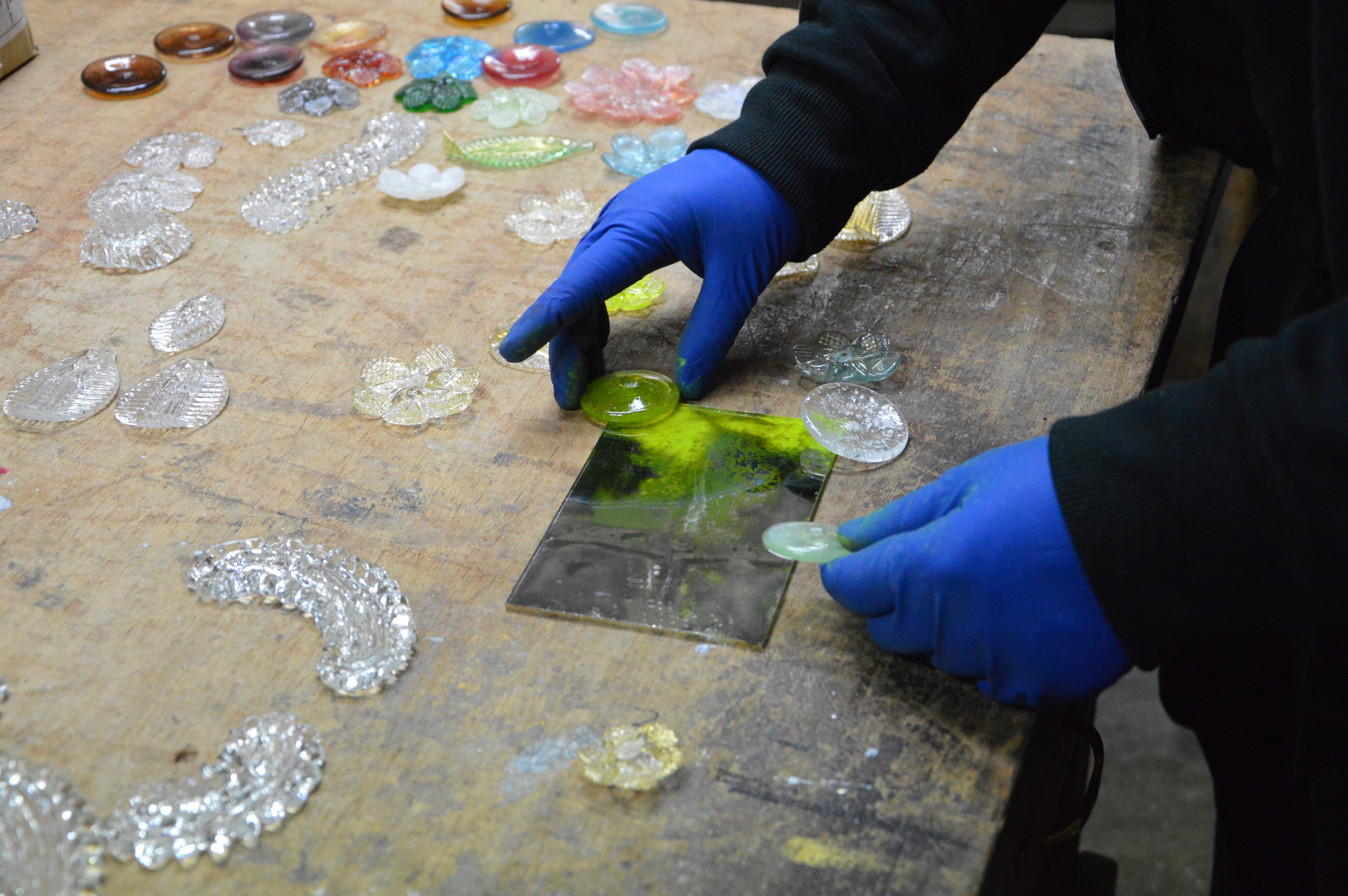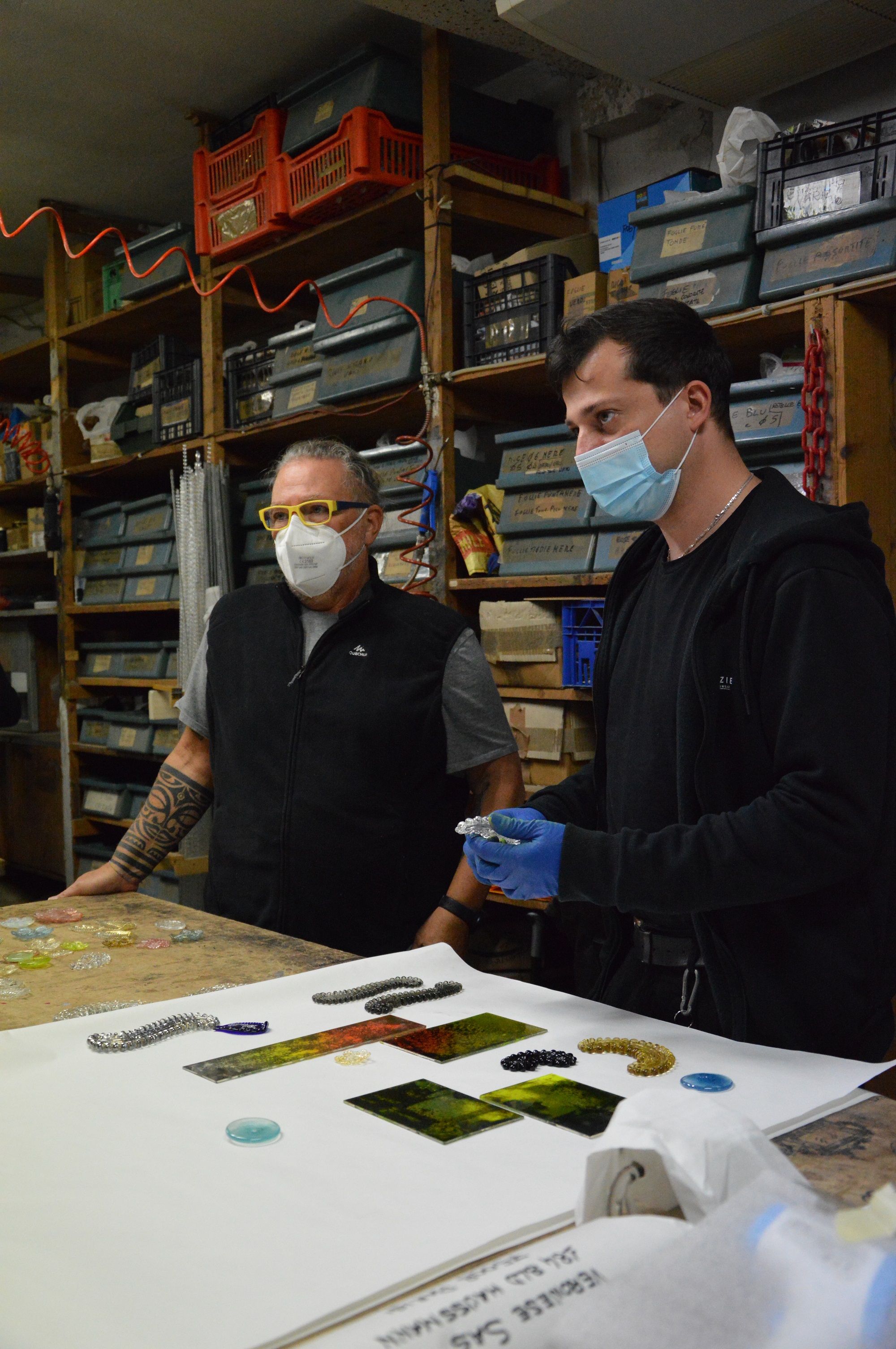 Below, selecting the handmade glass elements with Giuliano Fuga.