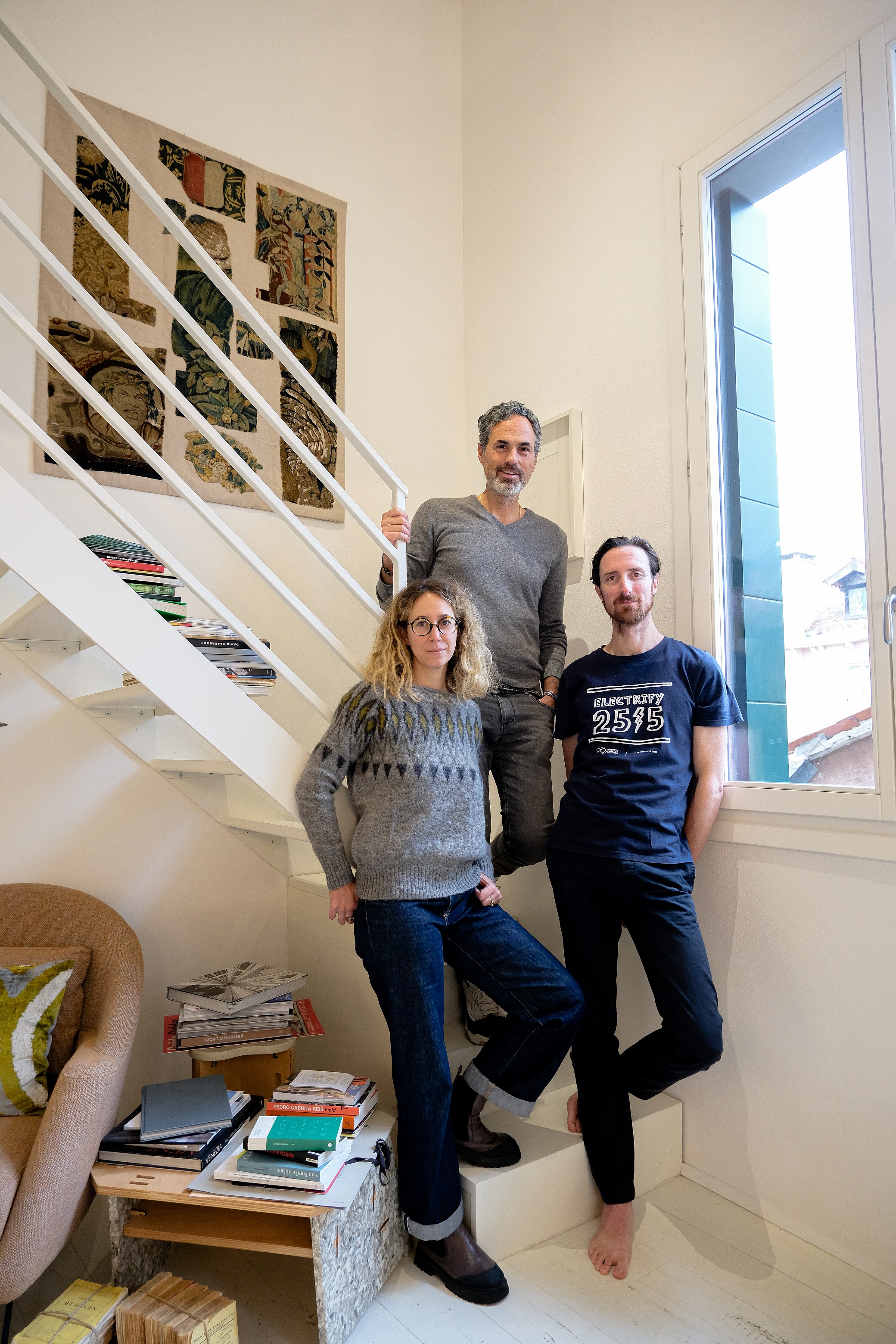 Curators Francesca Giubilei and Luca Berta with the designer.