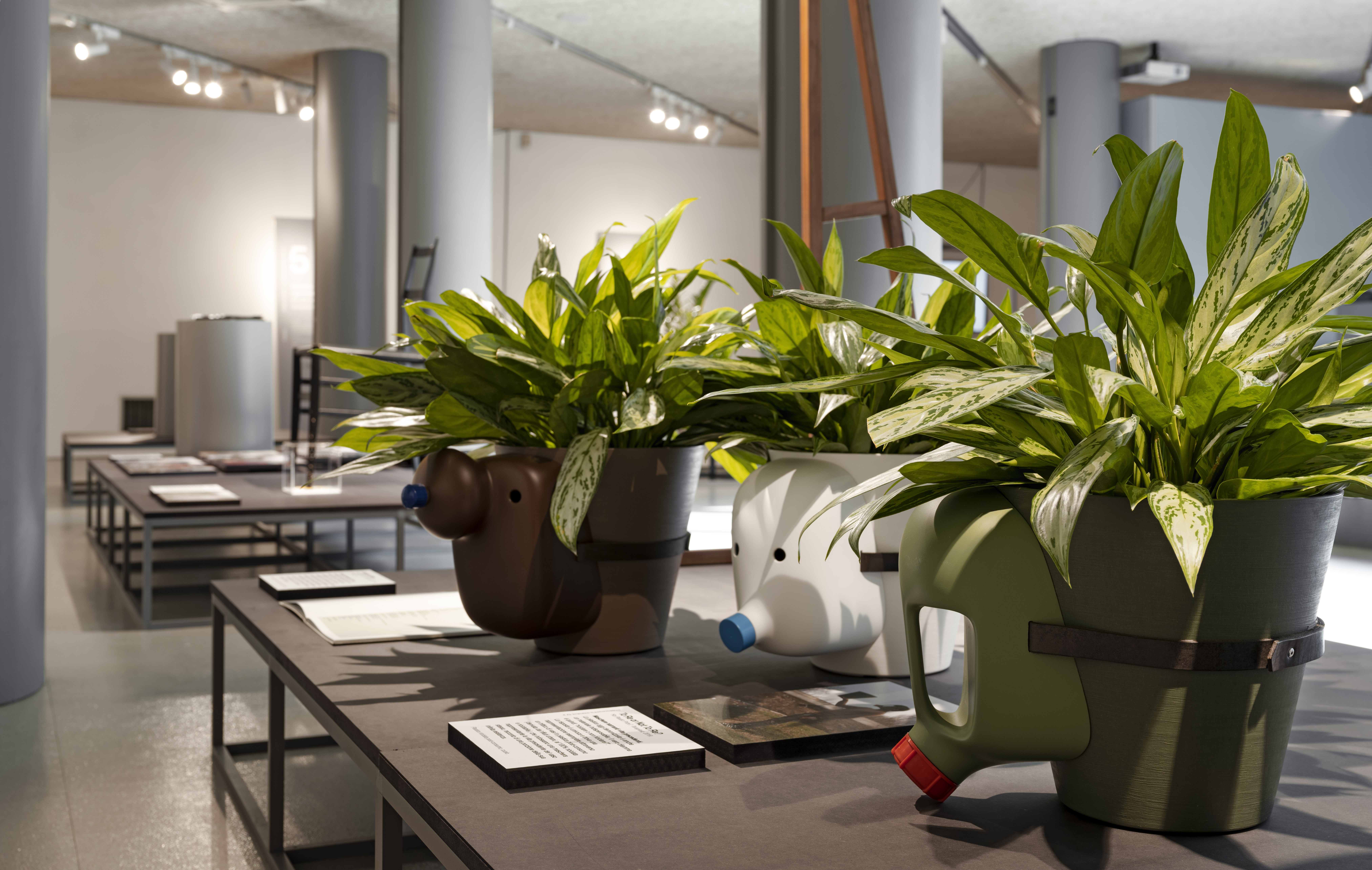 To assist the observer in translating concepts into visions, each practice has been paired with a video realized in partnership with Fabrica. The fourth practice (“transforming inconsistent behaviours into something useful”), for instance, becomes the subject for the video Life buffering, a desperate race toward a goal that remains unrevealed, a message that finds expression in the dilemma hidden by the work To Re or Not to Re?. A triptych of 100% recycled plastic plants pots symbolizes the ongoing issue concerning the use of plastic, a demonized but also indispensable material - the masks on the pots being a reminiscence of one of their many lives along an infinite existence.