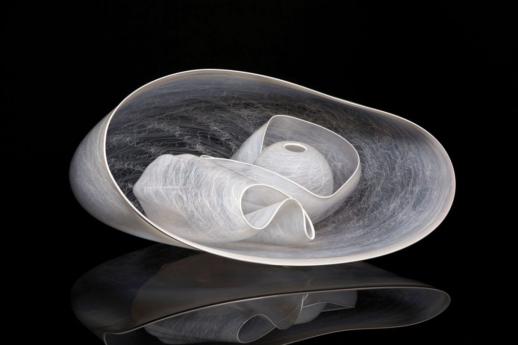 In these last works the artist merged the delicate refinement of merletto (the Italian word for lace) with his ability of shaping glass into organic and natural forms, aiming to capture the movement of lace in glass. In particular, using white cane of filigree glass he creates intricate, organic patterns, which seems to be real laces trapped into the glass.